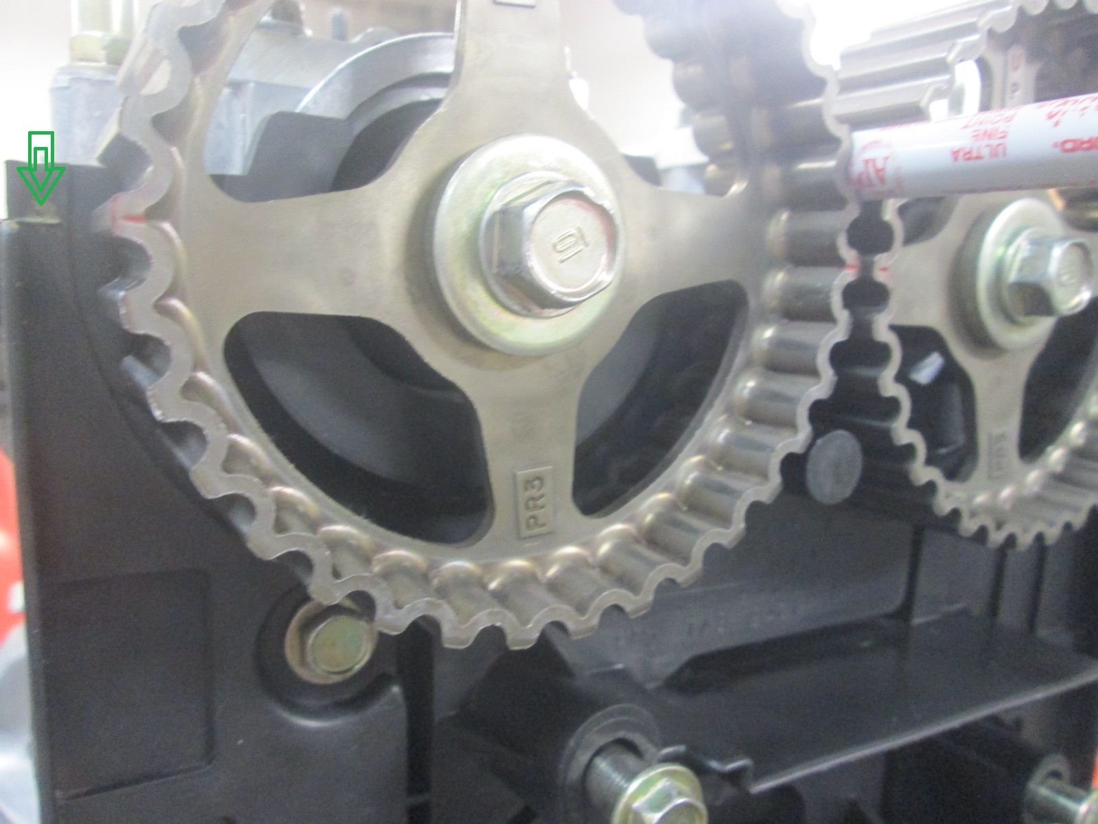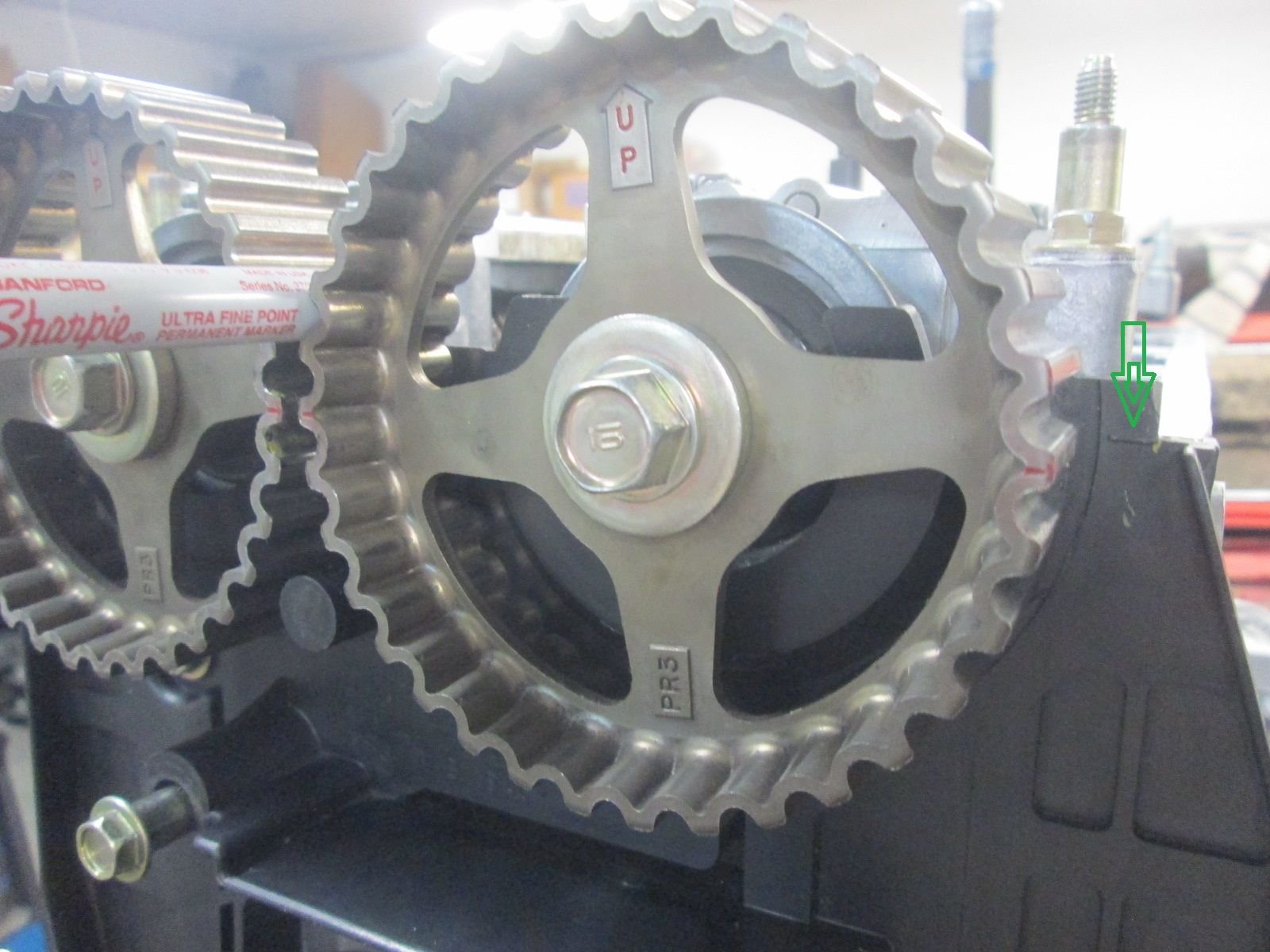 After about 20 minutes of trying to find a tool or scrap section of metal that would be just the right diameter/shape to jamb these two into alignment I eventually found the perfect holding jig in this sharpie pen. I was getting desperate and this was one of my last attempts as I was just about ready to order the tool...but this worked and most importantly no chance of damaging the sprockets with it in there. All the timing marks lining up here; including the lateral one on the plastic shroud.