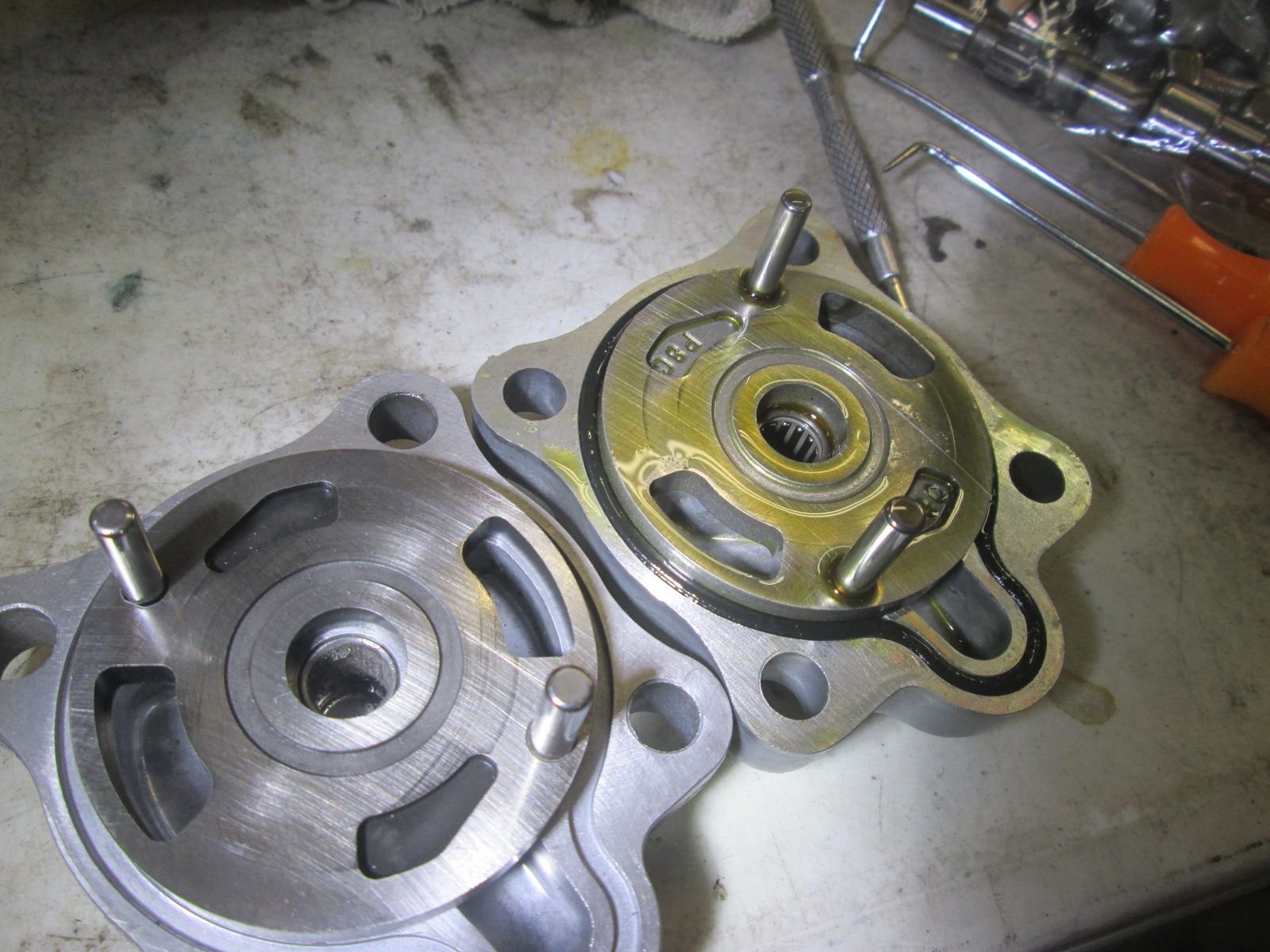 Technically I only needed the back cover with its new bearing but I decided to switch out everything and start fresh. The pump unit itself, the main shaft, internal valving, all of it.
