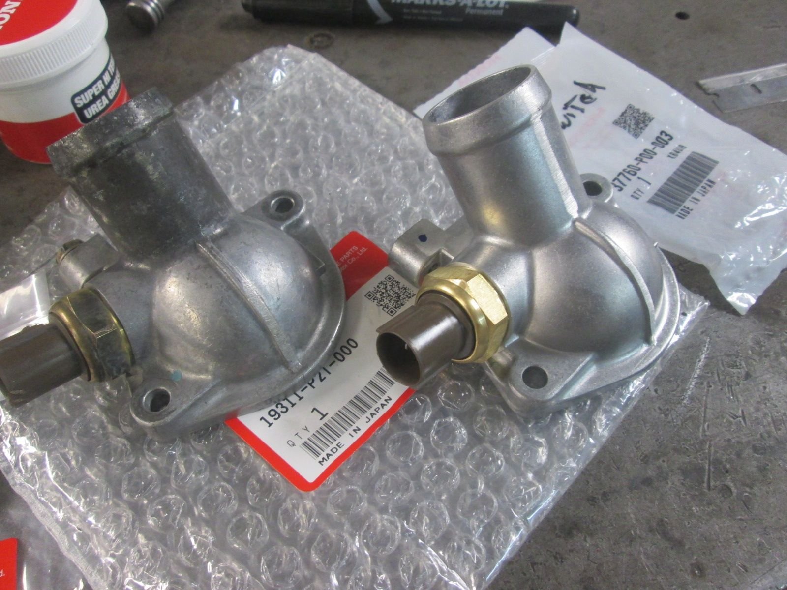 Shifted gears and went back installing some new fittings and sensors. Again I could not get a new thermostat housing but the cap is still available. The neck of the old one shows some electrolysis so I bought a new one along with a new fan switch sensor while I was at it.