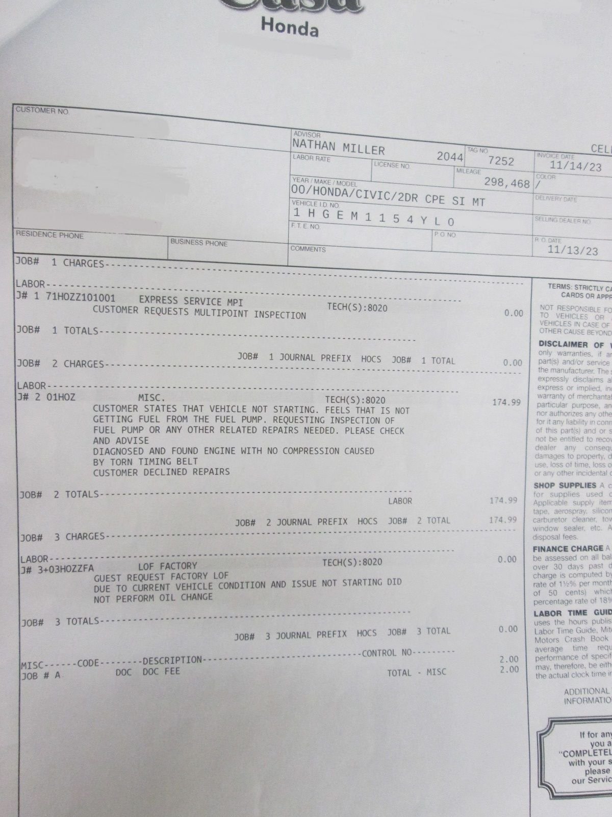 Adding this post to document the rehabilitation of our faithful old 2000 EM1 that we've owned since it was new. It was my Girlfriend's daily driver until late 2007 when she moved onto an '08 Accord. I gave her 8K for its down payment and took over the old SI. It had 78K miles at the time and I proceeded to add another 220K miles of nearly trouble free service as my daily driver. This is why I insisted she buy a Honda in the first place when looking for a new car. It burned a valve in 2019 at 250K miles so I had just the top end redone at the local dealership and kept going until last November. Then another dealerships misdiagnosis of broken timing belt at 298K miles put me on a track for an entire engine overhaul. I was pissed to later find out that it wasn't broken and that I most likely didn't have to pull the motor just yet but hey, I've had a great run and now was the time to give back this car. I'm done with dealerships and am rebuilding it myself with the help of a couple of good buddies. One of many things I love about this old girl is that through all the years and miles its gone it has never left me walking. This last 700 mile one way road trip was no exception. It got me in the driveway, then it restarted fine an hour later so I could pull it into the garage; A week later... the motor just cranked over and wouldn't fire. It acted like it was about to, but no go. The only bright spot was that it happened here in the garage and not out in the middle of nowhere. I suspected it was the fuel pump as again it seemed to almost fire up. Its the original pump and now being 23 years old with almost 300K miles on it, it seemed the likely culprit.(BTW: you can see the actual miles on it above. Just missed 300K by about 1,500 miles.) I had no tools there so I was pretty much at the mercy of a shop. I decided to have it towed over to the local Honda dealer for diagnosis and repairs. As you can see above they came back with a broken timing belt. I had a hard time believing that, as it only had 40K on a new replacement when I had the head redone. If they were correct then I was worried about internal damage to the Valve train etc. They offered to install a new timing belt but made me no guarantees that it would solve the problem. I wasn't going for that. I declined and had it picked up and towed back to the house the following day. A lot of money wasted to be right back whare I started. Two tows and a misdiagnosis ran me over 300 bucks! Eventually I had to get this car and myself back to Nevada so I started looking up quotes for auto transport and a plane ticket. Once I had an approximate total I thought of asking my lifelong buddy if he'd be interested in taking a little road trip. I offed him what it was going to cost me to get us both back. I thought better in his pocket than theirs. He was up for it so I rented a dolly and this shot was taken on the morning we left. Late that evening we had it safely in his shop. Begin pulling the motor to find out exactly what happened next. In the process of unplugging all the systems, bagging and marking all the bolts and hardware. Took several photos of the engine bay as it went to hopefully help me get things all back in the right place once its over. For the next session, we made the hard push to get the motor and trans dropped out of it. Fortunately my buddy Eric has a really nice shop with a two post lift which made so much easier. Thats him trying to pound out that roll pin that connects the shifter. We heard from several Honda guys that its one of the most frustrating things to remove. It did not disappoint! By sessions end we had the drivetrain out, disassembled with the motor stripped down to a long block.