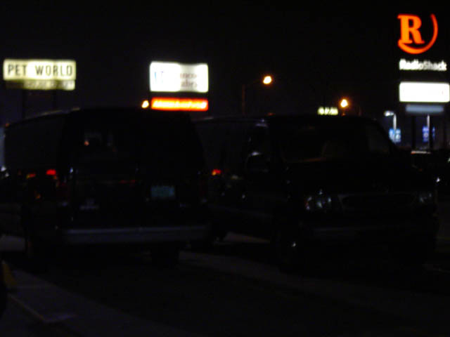 Suddenly another full size astro van pulls up. A guy, dressed in black, gets out. We notice this and start to ponder what they are doing. For the next 15 minutes, they sit there. Open up the back doors once or twice, and pull out and transfer some boxes between the two vans. While this is going on, people show up in various other vehicles, and park near the vans. They get out, also dressed in black, and take or leave a package and then go.