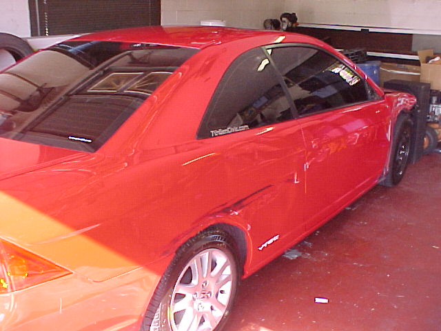so, contained within the estimate after inquiring were all my aftermarket parts wreaked havoc upon including the following: my Right Front 2003 Si 15" rim/tire, my right front JDM/Black-Housing headlight, my OEM foglight setup (will use on new bumper but fit in there properly and more than likely we be wired as well!! YAYY!), and yes; even down to the friggin reflective silver vinyl VTEC sticker was included on my estimate! also a part of the final quote were a new HONDA OEM front bumper, new side-skirt-ish thing railing do-hickey *LOL*, new 1/4 panels, new door panel, paint, and all that goes with it. Bob told me adamantly that State Farm believes in NOTHING but OEM-only parts at this shop. that made me feel 100% secure in my thoughts considering the bad experience i received from Recovery Room back in January for my AFTERMARKET replaced rear bumper! all in all, i was like, WOW, COMPREHENSIVE ENUF?!?! geeeeezzzeee louise! needless to say, i was QUITE impressed and dumbfounded on how awesome these ppl are to a mere "almost-there adult" in this day & age! very nice indeed! well, after the estimate was taken and the guy went inside to do some paperwork on the estimate, Timmermann came to pick me up (i'd called him @ work like 15 minutes previous) and we chilled patiently awaiting final tallies and my signature on the work-order form and whatnot. while waiting tho, we got to check out some of the other cars at the shop. 2 in particular that showed up today were: a Black Acura Integra Type-R that looked to have slid under a semi/bus/raised SUV with severe front and front-left impact points, and an undeniably sexy 2004 Gunmetal Metallic Acura TL Type-S (i think?) 6-speed with OEM body-kit, split 18in. gunmetal rims, HIDs...the works; with a pretty bad backed-into left rear door panel. the lady was real cool about letting Timmer and I stare in awe at the most majestic of Acuras ever made! she even told us bout the accident that happened Saturday night. she said some A-hole backed into her in a parking lot Sat. night! we said we were sorry but that no worries, it'd be fixed in a jiffy and her car is STILL hot stuff regardless. she thanked us and we went back to waiting.