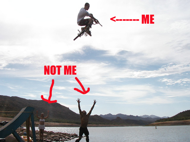 To everyone, we're supposed to go lake jumping this weekend. We take our BMX bikes and a giant ramp out to the lake and try out all kinds of crazy ish. We've been going to that lake at the end of Pima Rd. Seems to evade me right now as to it's name. It's a blast to watch and do. If anyone is interested, let me know as we're going sunday. Thats me in the pic too.