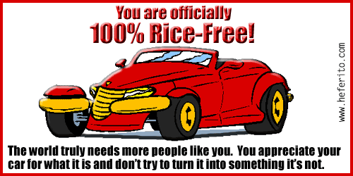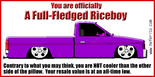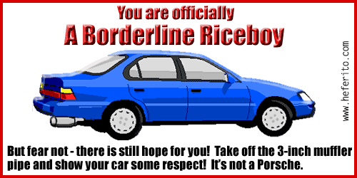 haha I descided to put down the stuff this guy I know has on his car. i always call him rice he says I am not and I enjoy my car, results ding ding ding Hes a wannabe ricer!