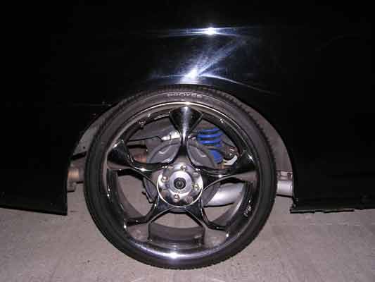 These are 18" chrome Nichi Shocks. Tires on them r 215 35 18 with good tred left, one tire needs to be replace due to camber ware but you can get awy with riding on it for a while. All the chrom is still in great if not perfect condition..there is one small pinky nail size curb damage...not to bad
