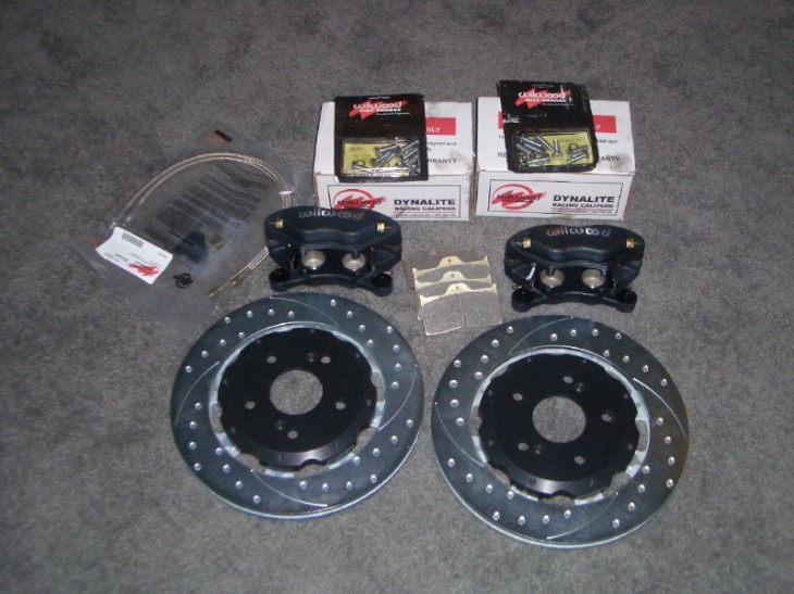 Wilwood Big Brake kit 12.19" slotted/drilled rotors, 4piston calipers, Steel braided lines, Q10 brake pades. I actually ordered just slotted rotors but wilwood screwed up and sent me flat faced. So, I sent it back, then they sent me drilled and slotted. So I figured I'd keep it and if I don't want it by the time my car is done I will sell it.