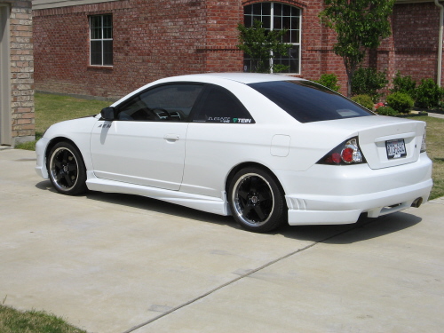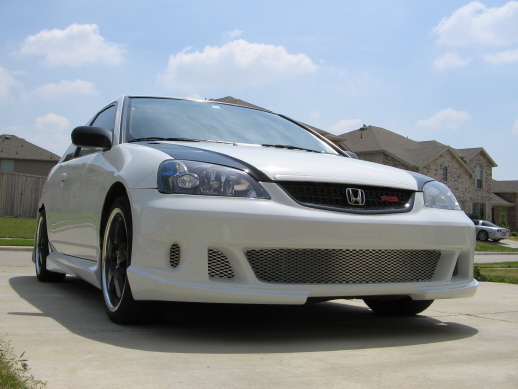 Got the kit installed and painted but a few minor issues came up! I dont know if you guys have ever noticed this but when you get ground effects painted, they never match the rest of the car. Its always a shade off. Well that is the case with mine. It always happens even though it is the right paint code. Also when i got my old POS fiberglass kit installed at a private body shop(not this one) those fvkers drilled holes in my rocker panel( the part directly underneath the door)! The reason being is because they had to apparently drill the side skirts into the door sill! B**tches! So now i have three bb sized holes in each door sill that you can see with the door closed! Well the owner of the shop is cool as hell and is gonna cut me a break! He is gonna paint the entire car and remove all of the dents for 590 bucks! And this paint job is very similar to the way the factory paints it only he isnt putting several layers on. It is a base coat with integrated urethane and then a full clear coat over that! The paint job alone is worth $1000 and hes doin in for $229! The other $360 is to remove the dents! Ohh he also offered to throw in a little bit of a pearl color of my choice if i wanted to! It wouldnt be like color changing or anything but more like some of the cadilacs you see today but not that purplsih color! The color i was lookin at was a silverish color! Do you guys think that would be straight or should i leave the factory paint? Ill take some pics of what it looks like now after i get it washed today!