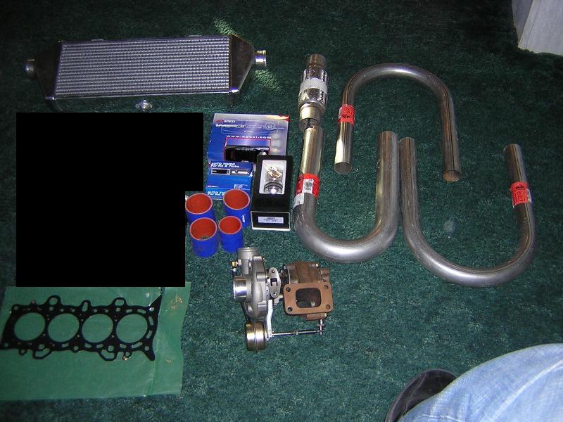 First off you're missing lots of things. I don't see any coolant/oil lines. Just some pipes that still need to take shape for your charge pipes and downpipe. Also no real tuning device. An safc isn't going to do much more than act as a bandaid for lack of fuel management. The ic is decent size. What turbo is that? You'll possibly need an actuator for your internal wastegate unless its already set for the 8 lbs you mentioned. The apexi twin chamber is nice though. I guess run it by dezod or any of the other longtime turbo guys on here. Theres a lot that is lacking so far. You'll get there though.