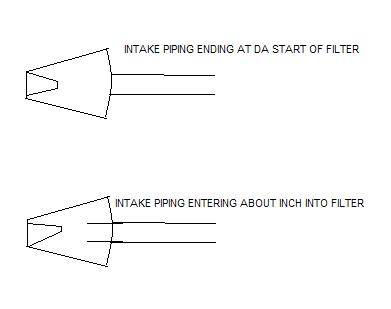Honestly How could about an inch of pipe further into the filter make a difference of such? Its a 3" Filter starting with a 2.5" pipe from the engine then goes to 3" Pipe at the end.