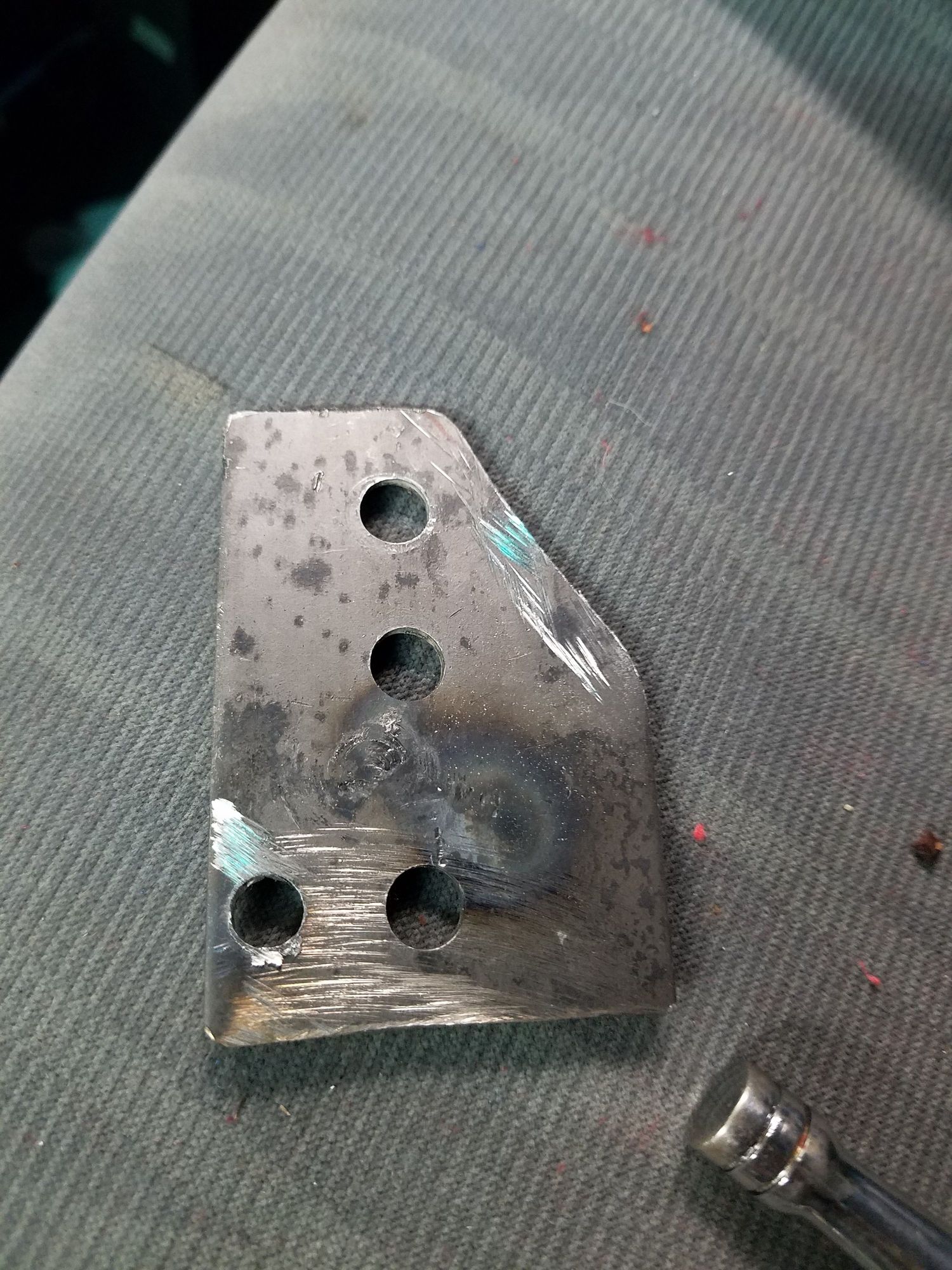 Final plate. The angled cut is necessary to clear the shifter boot cover. Bottom two holes for mounting. I drilled two holes to try different throw angles. Utilizing the top hole brings the throw down to 2.75 inches.